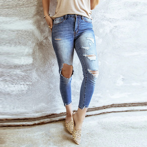 欧美跨境秋冬新款女装修身高腰脚口破洞弹力小脚裤牛仔...