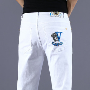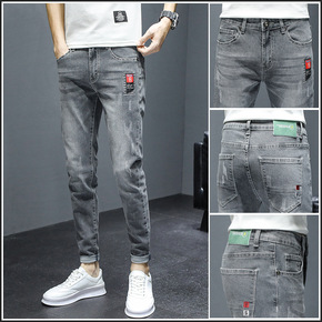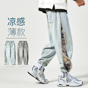 2022潮牌男装牛仔裤夏季薄款时尚烫钻刺绣韩版潮浅...