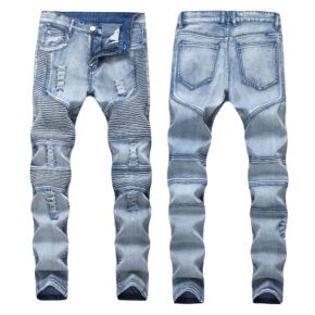 欧美外贸褶皱破洞牛仔裤男 弹力修身小脚男士牛仔裤潮...
