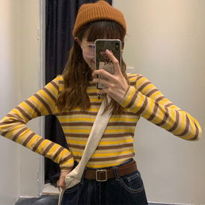 撞色条纹T恤女2020秋季韩版修身显瘦圆领百搭in...