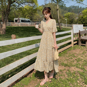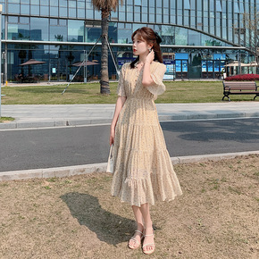 连衣裙2021新款夏季中长款收腰显瘦气质仙女黄色碎...