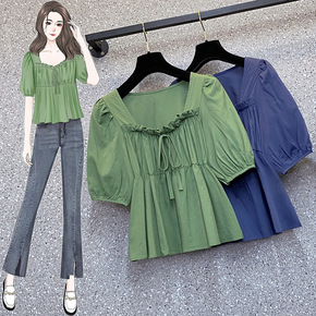 方领褶皱短袖套头衬衫女2021夏装新款韩范洋气设计...