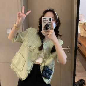 韩国Chic夏季新款气质小香风粗呢单排扣显瘦短袖西...
