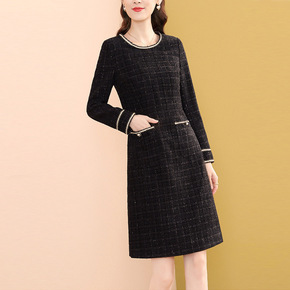 欧洲站黑色长袖名媛小香风收腰连衣裙2021秋冬新款...