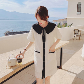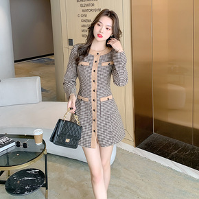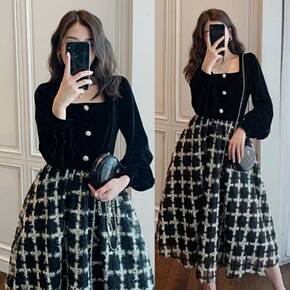 胖大码小香风格子拼接丝绒连衣裙女春装收腰假两件仙女...