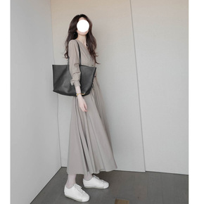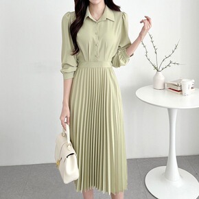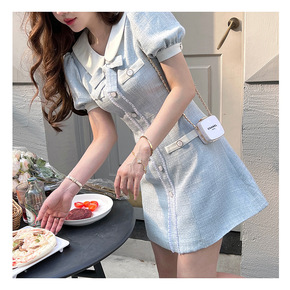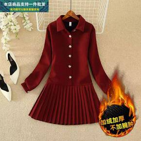 韩国chic春季新款翻领百褶小香风轻奢连衣裙女收腰...