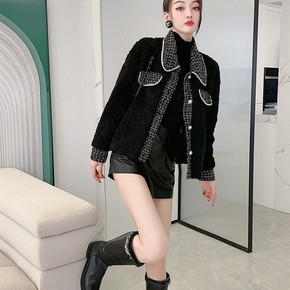 冬季新品小香风套装复古皮质拼接格子毛呢外套+气质短...