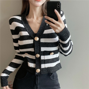 法式甜美小香仿貂毛针织衫薄款套头V领撞色短款上衣女...