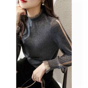 打底衫女半高领木耳边半高领长袖针织打底衫女2021...
