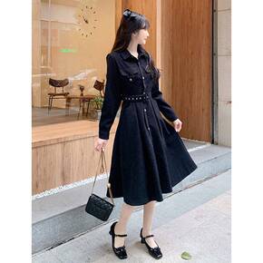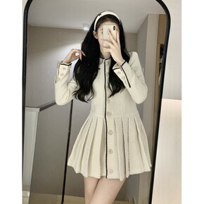 2021冬季新款小香圆领长袖单排扣小个子百褶连衣裙...
