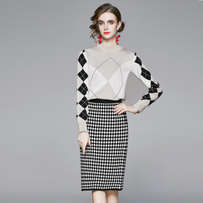 小香风气质v领格纹针织连衣裙女2021秋装时尚撞色...