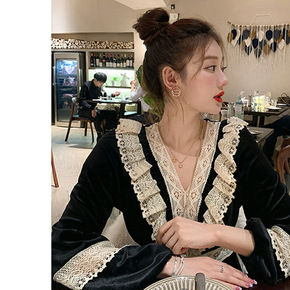 法式复古别致高级感小香风蕾丝拼接裙子赫本风黑色丝绒...