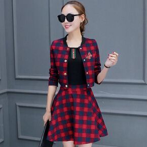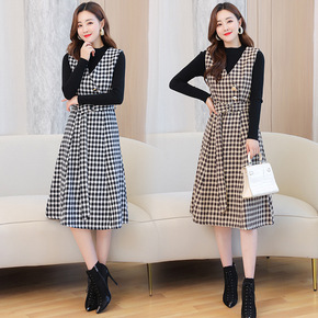 秋装格子两件套长袖连衣裙套装女春秋新款小香风短外套...