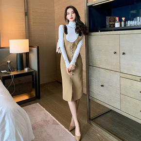 2021秋冬装小香背带连衣裙气质包臀女神范中长款开...