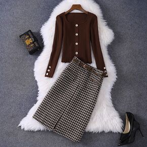 大码女装小香风套装裙女秋季针织衫上衣格子半身裙洋气...