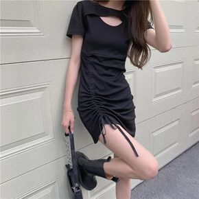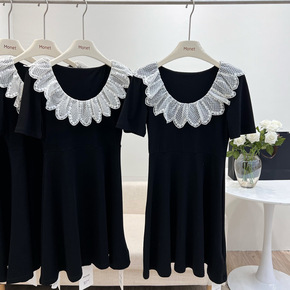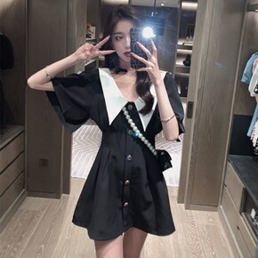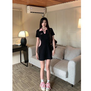 收腰连衣裙2022翻领风可爱甜裙系小黑裙酷短袖新款...