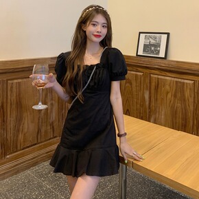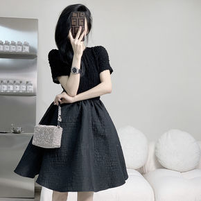 黑色连衣裙女2022新款夏装法式气质方领显瘦赫本风...