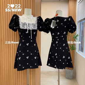 蕾丝拼接茶歇法式复古黑色碎花连衣裙女夏温柔感赫本风...