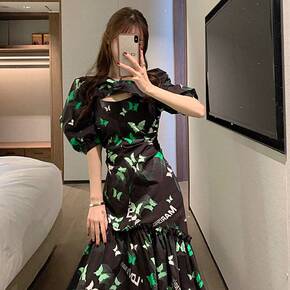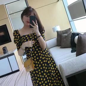 2022夏韩版泡泡袖收腰过膝连衣裙法式赫本风气质蕾...