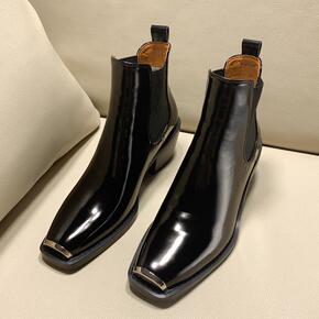 CK方头切尔西靴子头层牛皮女鞋英伦粗跟时装秋季短筒...