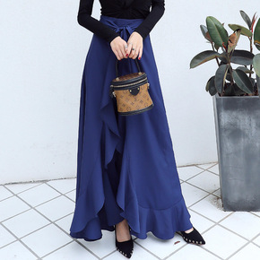 欧洲站 新款女式休闲裤裙欧美不规则荷叶蝴蝶结高腰长...