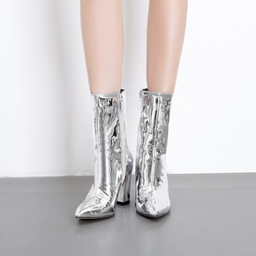 秋冬季欧美大码时装靴女高跟加绒保暖马丁靴尖头粗跟短...