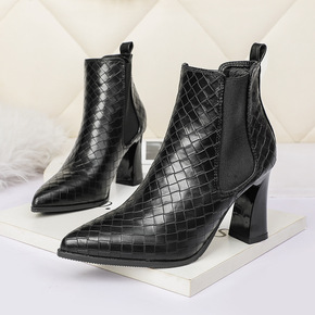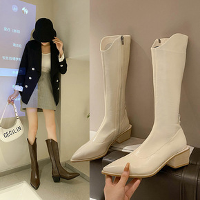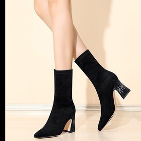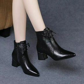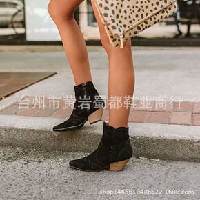 尖头时装靴女2022秋冬季新款高跟舒适粗跟休闲短筒...