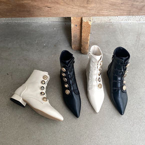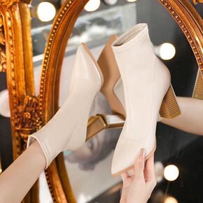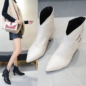 白色法式小短靴女春秋单靴新款~·中粗跟尖头弹力靴子...