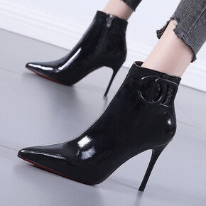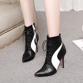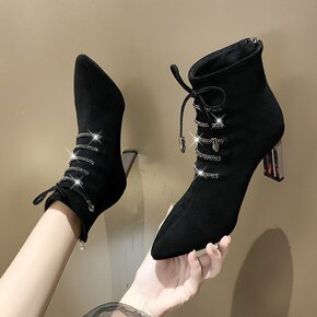 2022秋冬新款女士短靴细高跟尖头女靴时尚交叉绑带...