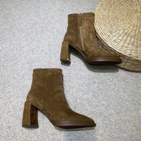新款欧货尖头高跟短靴女粗跟春秋单靴侧拉链棕色磨砂靴...