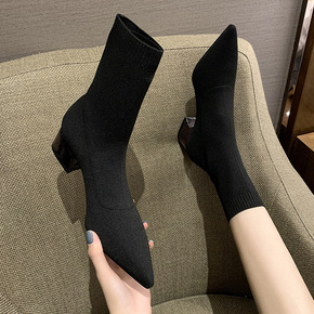 短靴女2020春秋新款针织粗跟单靴尖头弹力靴百搭黑...