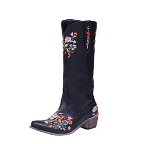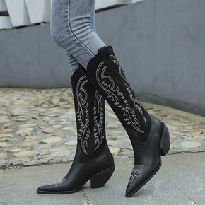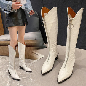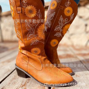 西部牛仔靴女尖头粗跟刺绣长筒靴2021秋冬新款马丁...