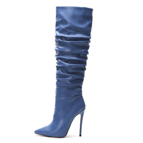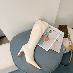 新款冬季加绒细跟跟女鞋欧美风时尚褶皱堆堆靴高筒靴外...
