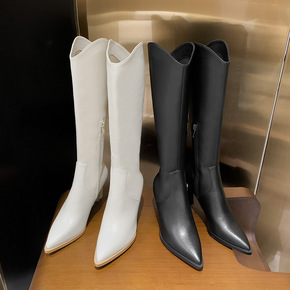 西部牛仔靴女2021秋冬新款尖头V口小个子长筒靴高...