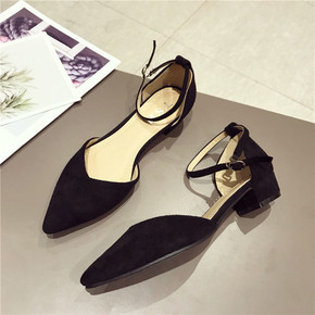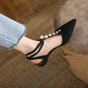 里外全皮方跟尖头丁字扣珍珠后空单鞋羊翻皮韩版复古平...