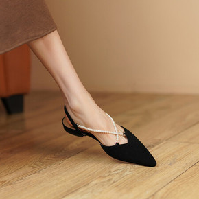 里外全皮方跟尖头珍珠链条交叉搭扣包头凉鞋羊翻皮韩版...