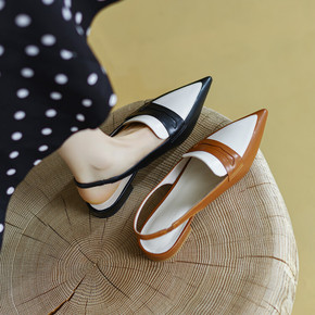 里外全皮方跟尖头后空拼色单鞋牛皮时尚简约简复古平底...