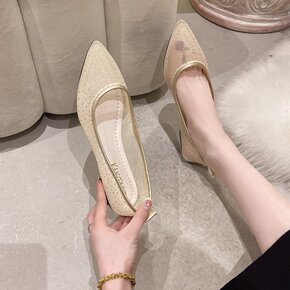 单鞋女平底工作鞋2022春夏季网状波点尖头鞋蕾丝网...