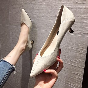 单鞋女春夏新款深口女鞋尖头鞋子女真软皮鞋气质粗跟妈...
