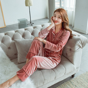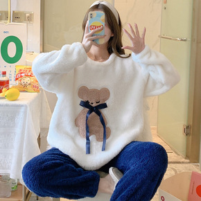 韩国绒冬季睡衣女 舒适保暖家居服套装V领休闲柔软长...
