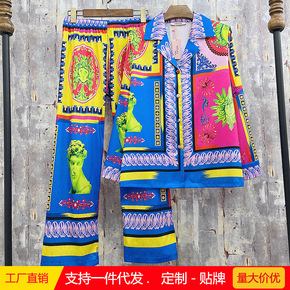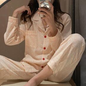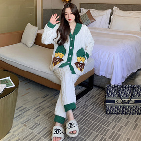 新款可爱印花女士睡衣现货翻领女士家居服批发针织长袖...