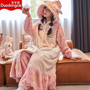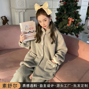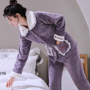 秋冬睡衣女珊瑚绒套装开衫法兰绒家居服加厚加绒可外穿...