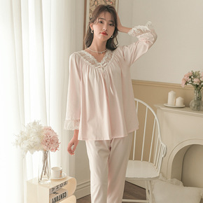 逸尔乐睡衣女士春秋款针织棉长袖家居服宫廷公主风蕾丝...
