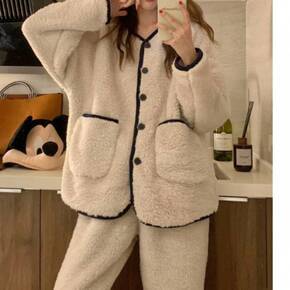 日系甜美冬季加绒法兰绒保暖宽松睡衣套装女生可爱开衫...