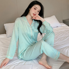 冰丝睡衣女春款新款长袖开衫休闲甜美夏天薄款绸缎家居...