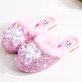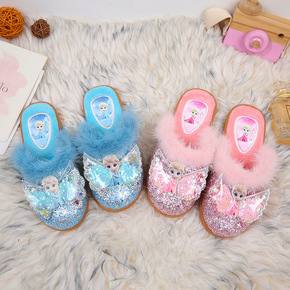 女童爱莎公主毛毛拖鞋半拖鞋儿童闪闪亮片棉拖鞋宝宝家...