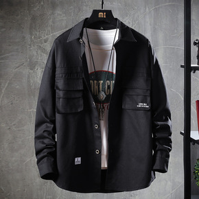衬衫男士痞帅2021春秋季新款工装宽松拼接休闲dk...