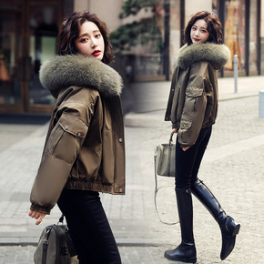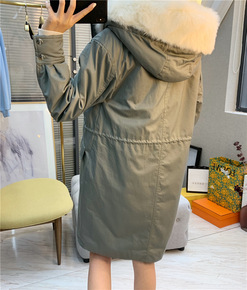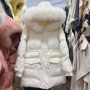 凡兔狐狸毛领抽绳收腰派克服2021冬季新款工装风仿...