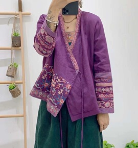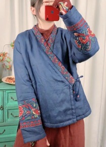 棉衣复古民族风重工刺绣亚麻开衫棉服女宽松V领加棉茶...