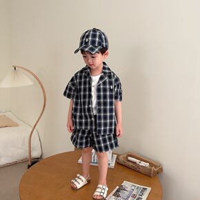 韩国童装学院风格子两件套装夏季儿童时髦短袖衬衫男童...
